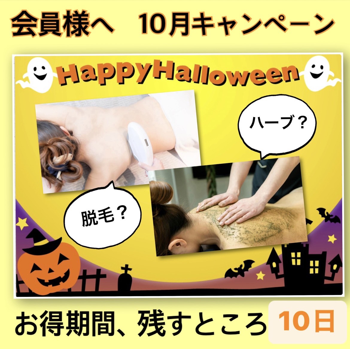 シミ、シワ改善ハーブピーリングと美肌脱毛が自慢のサロンドヒノキ渡邊です。 ただ今10月中、会員様向けのお得なハロウィン🎃キャンペーンを行っています! 全身脱毛(顔、VIO除く) → ¥4,950背中ハーブ腰上丸ごと → […]